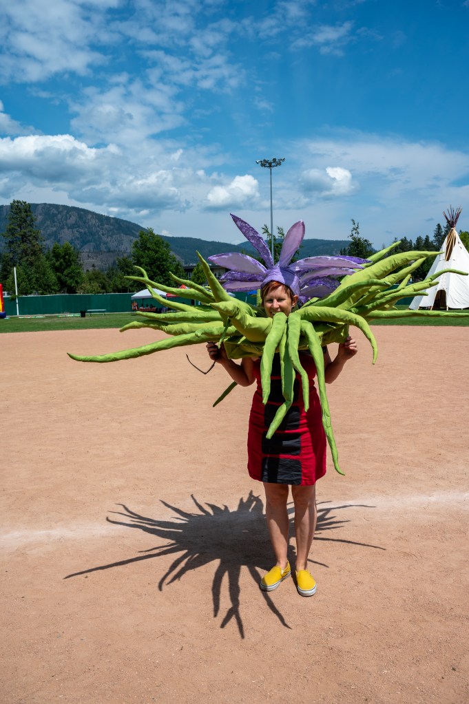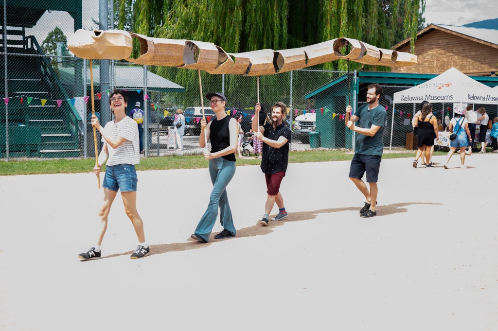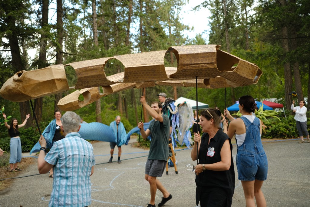 Floodplain and riparian habitats that extend out from creeks and rivers are critical to life in the Okanagan valley. In Kelowna, the watershed’s largest city, an entirely channelized waterway by the name of Brandt’s Creek, runs from an urban residential district to the valley bottom, where it once opened into a marshy floodplain. While it is not currently possible, nor perhaps desirable, to return this channel to its former marshy self, this creek requires care, attention, and room to roam in order to accommodate floodwaters in times of swell, an increasing concern for this habitat and neighboring communities. As a way of inviting community members to expand and explore their relationships with Brandt’s Creek, we have created a large-scale, mobile puppetry project that moves within the historic floodplain of this creek.